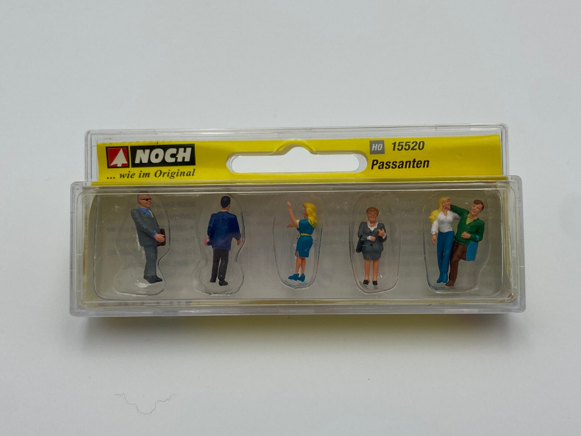 Eine feine ältere Dame im grauen Kostüm steht wartend. Ein sportliches junges Paar geht Arm in Arm. Ein Herr im feinen blauen Sakko steht wartend. Eine blonde Dame im blauen Kleid steht gestikulierend, ein grauhaariger älterer Herr im grauen Anzug mit Aktentasche unter dem Arm geht schnellen Schrittes. Das Figurenset ist ideal geeignet um Stadt- oder Dorfszenen auf Modelleinbahnanlagen zu dekorieren. Die Modellfiguren sind insbesondere für die Dekoration von Städten und Dörfern auf Modelleisenbahnanlagen und Dioramen geeignet.