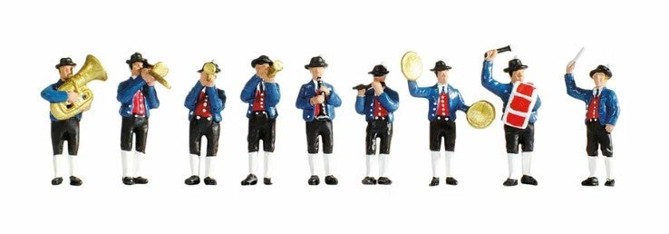 Das Set für die Spur H0 (Maßstab 1:87, ca. 2 cm hoch) beinhaltet neun Musikanten, die gemeinsam eine Musikkapelle bilden.