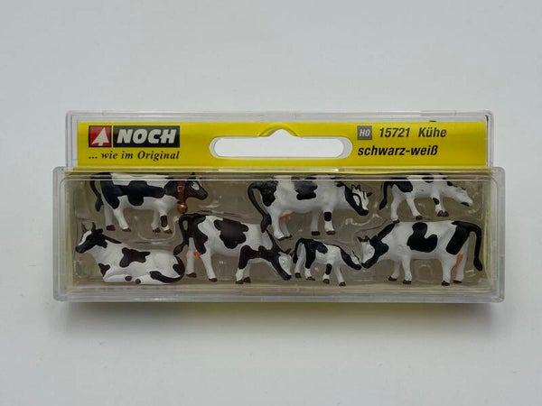 Das Set für die Spur H0 (Maßstab 1:87, ca. 2 cm hoch) enthält fünf Kühe sowie zwei Kälber, die alle schwarz-weiß gefleckt sind.
