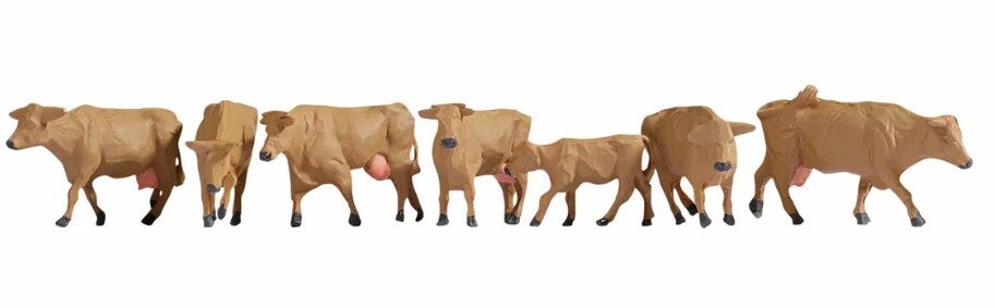 Das Set für die Spur H0 (Maßstab 1:87, ca. 2 cm hoch) beinhaltet sechs ausgewachsene Kühe und ein Kälbchen.