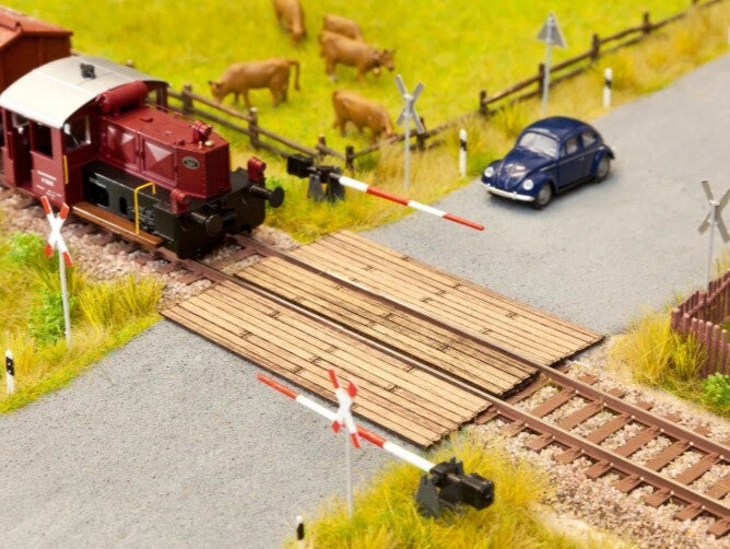 Die NOCH Laser-Cut minis Szene "Bahnübergang Holzbohlen" eignen sich ideal, um realistische Bahnszenen in jeder Modelllandschaft noch detailvoller auszugestalten. Die Holzbohlen ermöglichen dem gleisenden Zug eine sichere Überquerung des Bahnübergangs. Gerade an Stellen, an denen andere Verkehrsteilnehmer wie Autos, Motorräder, Lkws oder Traktoren die Zugschienen überqueren, werden Bahnübergänge in Form von Holzbohlen angebracht. Bringen Sie dieses realistisch nachgestaltete Detail auf Ihre Modelllandschaft. Hier ist ein Unterschied zum Original kaum zu erkennen.