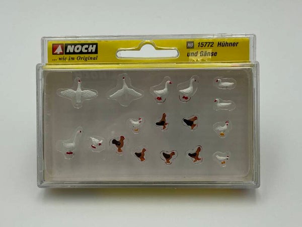 Das 18-teilige Set für die Spur H0 (Maßstab 1:87, ca. 2 cm hoch) besteht aus Gänsen und Hühnern.