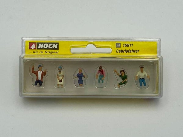 Die liebevoll handbemalten Figuren eignen sich ideal, um Cabrio Fahrten darzustellen. Eine Frau in grünem Kleid winkt freundlich aus dem Auto heraus, während ihr Mann in weißem Hemd fährt. Ein weiteres Paar, sie in lila Kleid mit schwarzem Gürtel, er mit brauner Jacke über einem grünen Hemd, genießt die Fahrt in ihrem Cabrio. Die Frau fährt, während ihr Mann sich an der schönen Landschaft erfreut und jubelnd die Arme hoch streckt. Eine weitere Frau und ein weiterer Mann tragen Sonnenbrillen und genießen den Fahrtwind.