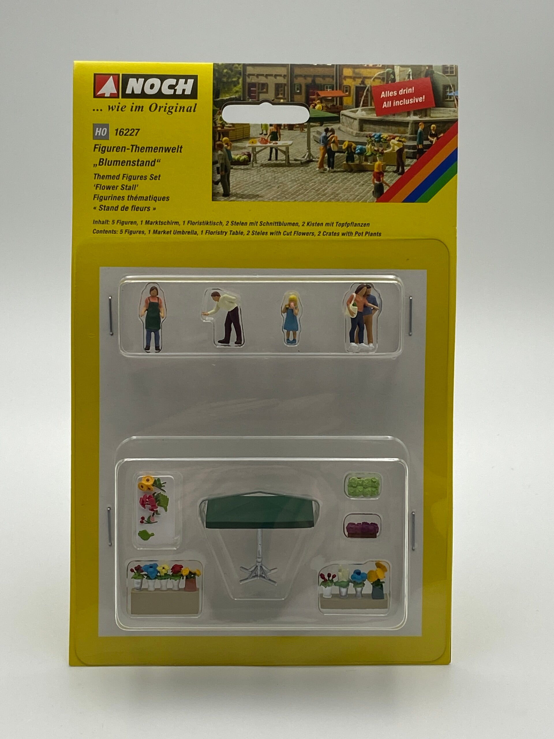 Inhalt: 1 Figur "Floristin Sarah", 4 Figuren, 1 großer Marktschirm, 1 Floristiktisch mit Schnittblumen, 2 Stelen mit Schnittblumen in Vasen, 2 Kisten mit Topfpflanzen