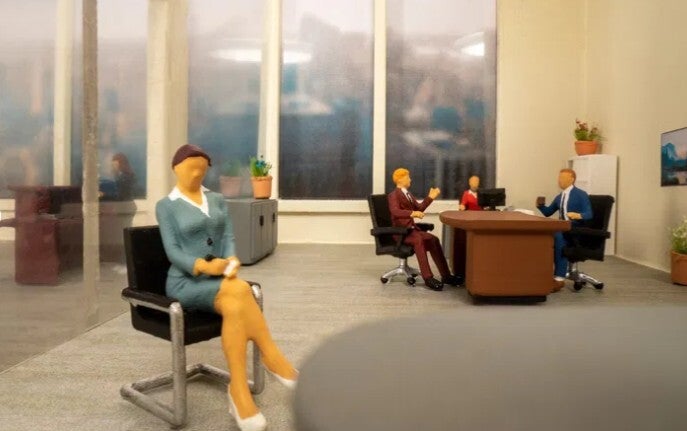 4 sitzende Modellfiguren, 1 stehende Modellfigur, 1 großer Schreibtisch, 1 kleiner Schreibtisch, 1 Empfangstheke, 1 Sideboard, 1 Wandregal, 1 Besprechungstisch, 4 Stühle