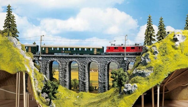 Nach einer Probefahrt beginnen Sie mit dem Gestalten der Landschaft – über und um die Gleisanlage herum. Dabei bauen Sie als erstes das zeltähnliche Gerüst auf. Da die Rundstäbe nur in die Verbindungselemente eingesteckt sind, kann die Konstruktion jederzeit korrigiert und verändert werden. Durch dieses Gerüstsystem ist ein nachträgliches Umgestalten genauso problemlos möglich wie die laufende "Wartung" der Schienen und der gesamten Technik. Steht das Gerüst, wird es anschließend mit NOCH Gelände-Krepp überzogen und bildet nun Ihren "Gelände-Rohling", den Sie ganz nach Ihren Wünschen weiter ausgestalten können