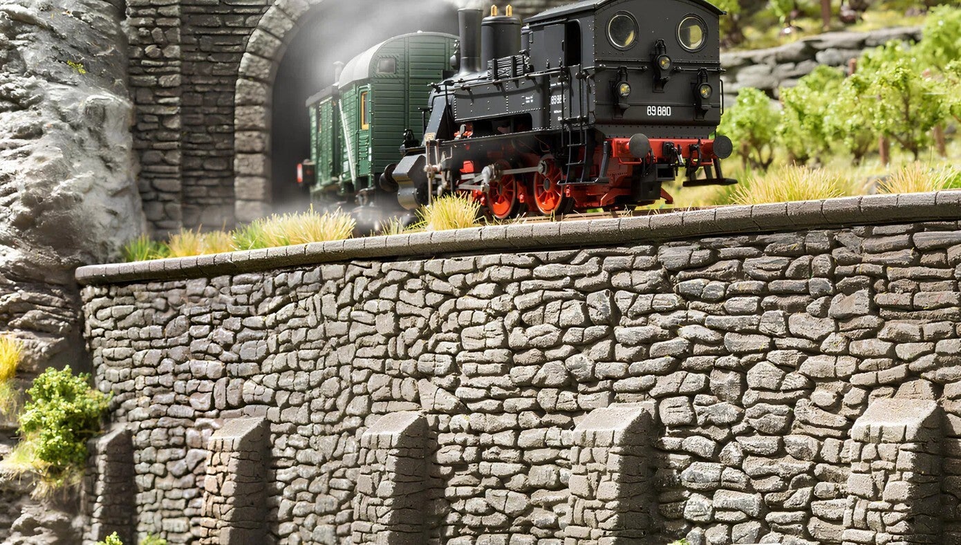 Natursteinmauern sind vor allem in ländlicher Umgebung sehr häufig zu finden. Die Mauern, Arkaden und Portale werden dabei kunstvoll mit Hilfe von regional gebrochenen Steinen erbaut. Die Hartschaum-Serie "Natursteinmauer" begeistert durch ihre äußerst realistische Gesteinsstruktur und die mehrdimensionale Gestaltung vieler Details wie Simse oder Vorsprünge. Die Portale sind für Oberleitungs-Betrieb geeignet.