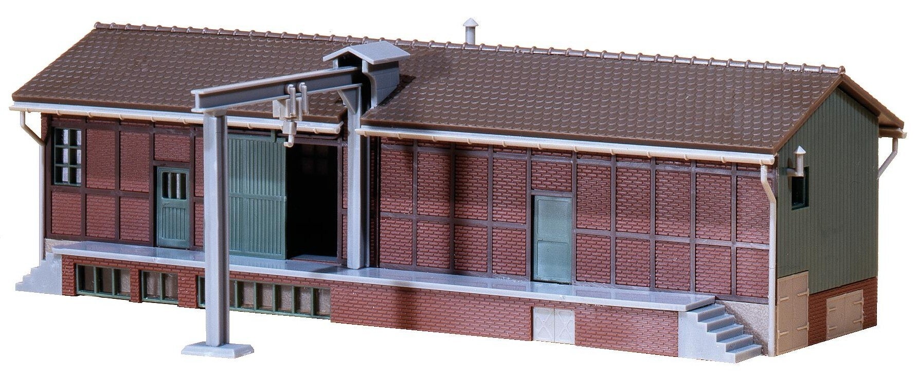 Lagerschuppen mit angebautem Verladekran und Vordach. Im Bahnbereich oder z. B. als BW-Materiallager einsetzbar.