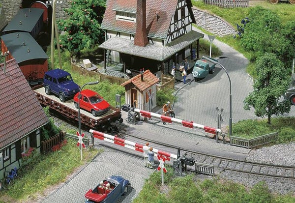 Beschrankter Bahnübergang mit zwei kleinen Häuschen, Fußgänger-Drehkreuz und Schranken. Für alle gebogenen Modellgleise.