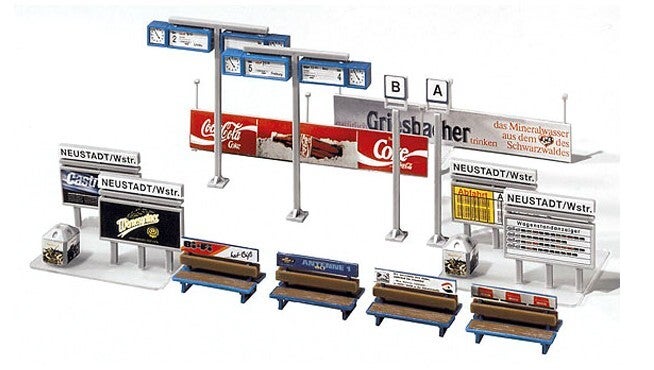 Enthält verschiedene Werbetafeln, Fahrpläne, Bänke, Abfallkörbe, Uhren und Zuglaufanzeigen. Passend zu der Bahnsteighalle (Art. 120199).