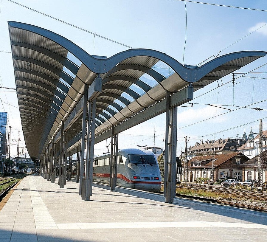 2 ICE-Bahnsteige in moderner Ausführung, mit verglastem Warteraum, Sitzbänken, Papierkörben und Hinweistafeln. Beliebig verlängerbar. Beleuchtbar mit Lichtleiste (Art. 180654).