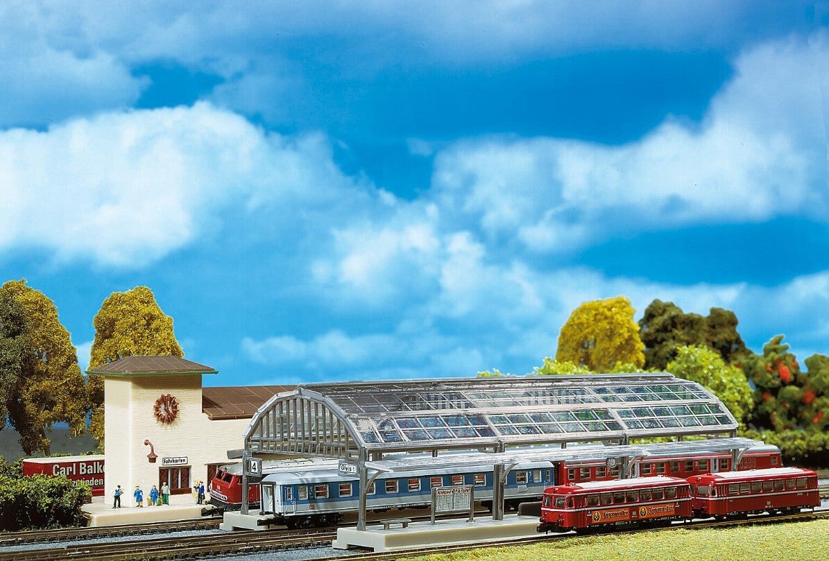 Glasüberdachte Hallenkonstruktion für 2-gleisigen Verkehr, 167 mm lang. Für Oberleitungs- und Dampfbetrieb geeignet. Die Halle kann mehrfach hinter- und nebeneinander gebaut werden. Mit Bahnsteigen (Art. 282718) ergänzbar.