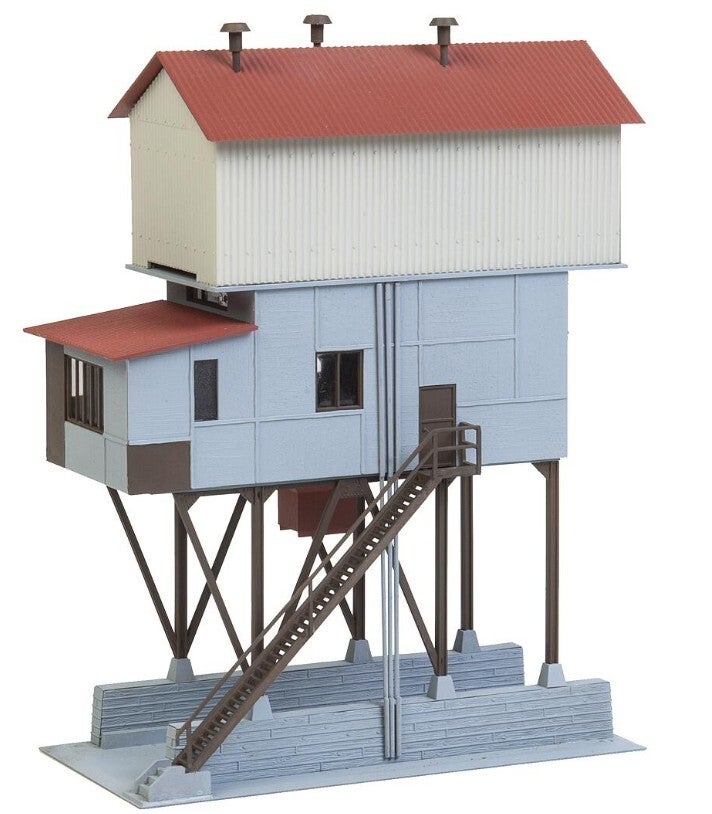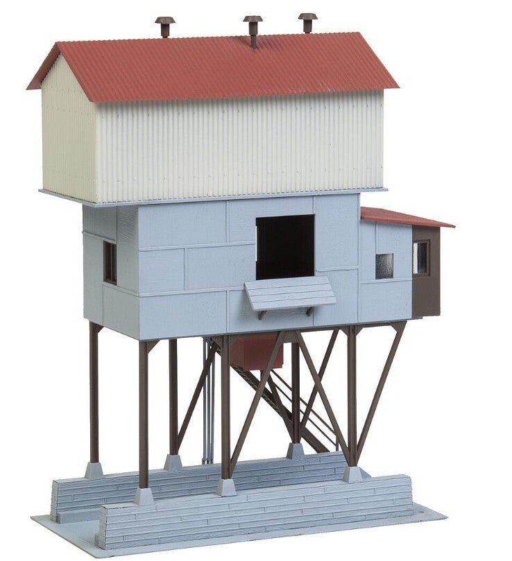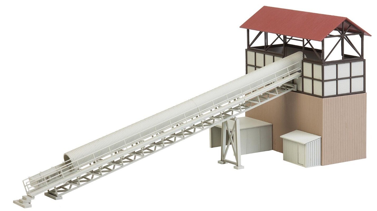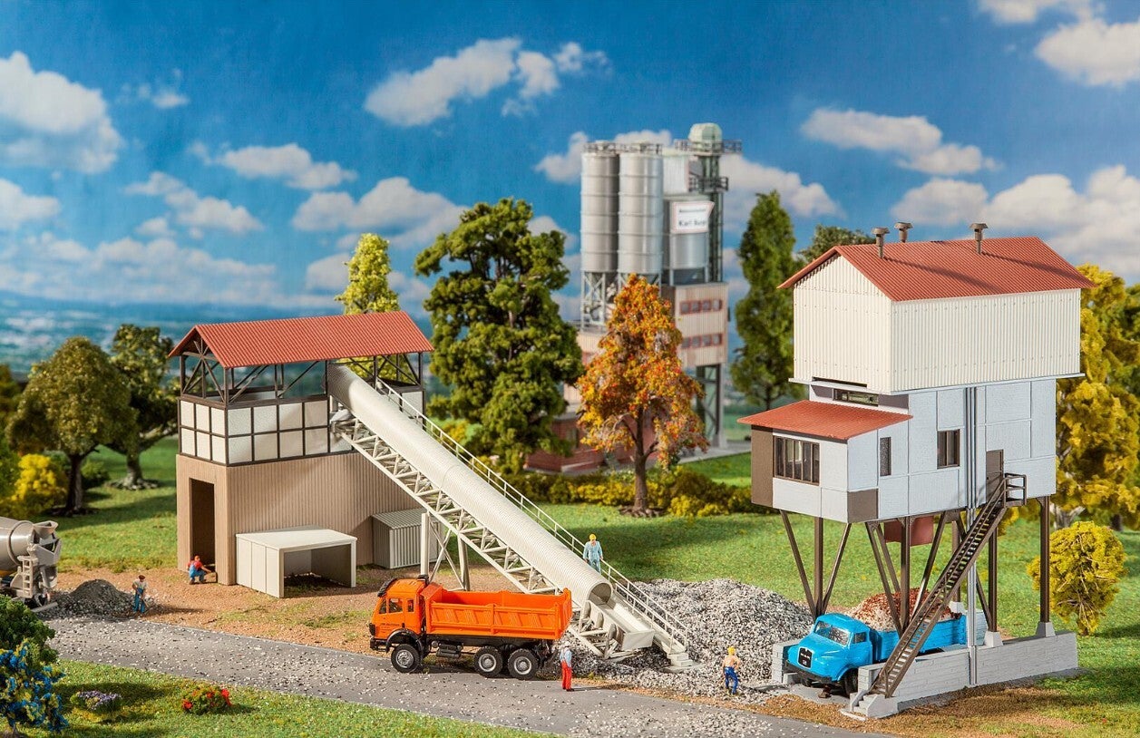 Mehrteiliges Kieswerk bestehend aus einem Vorratssilo mit Eisenfachwerk für die Zwischenlagerung und einem für verschiedene Modellgleise oder als LKW-Fahrstraße geeigneten Verladesilo mit Treppe. Zwei kleine Schuppen und ein Förderband für die Beschickung und den Abtransport des Schüttguts komplettieren das Set.
