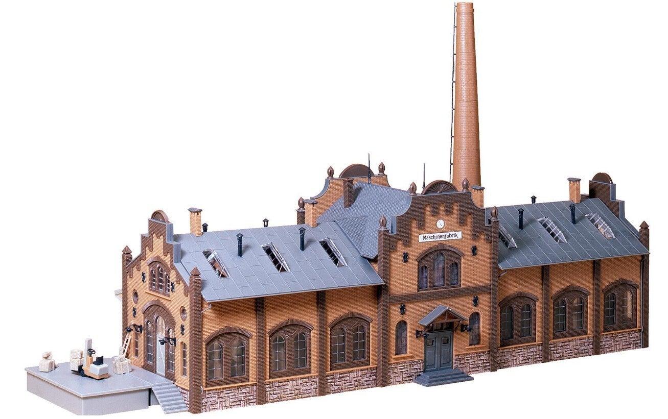 Stattlicher Gebäudekomplex mit Verwaltungstrakt, Produktionshalle und Lager mit überdachter Verladerampe. Die Oberflur-Förderanlage mit Transportkästen, die die Produktion mit dem Lager verbindet, kann mit dem FALLER-Motor (Art. 180629, 12-16 V, Wechselspannung, liegt nicht bei) angetrieben werden.