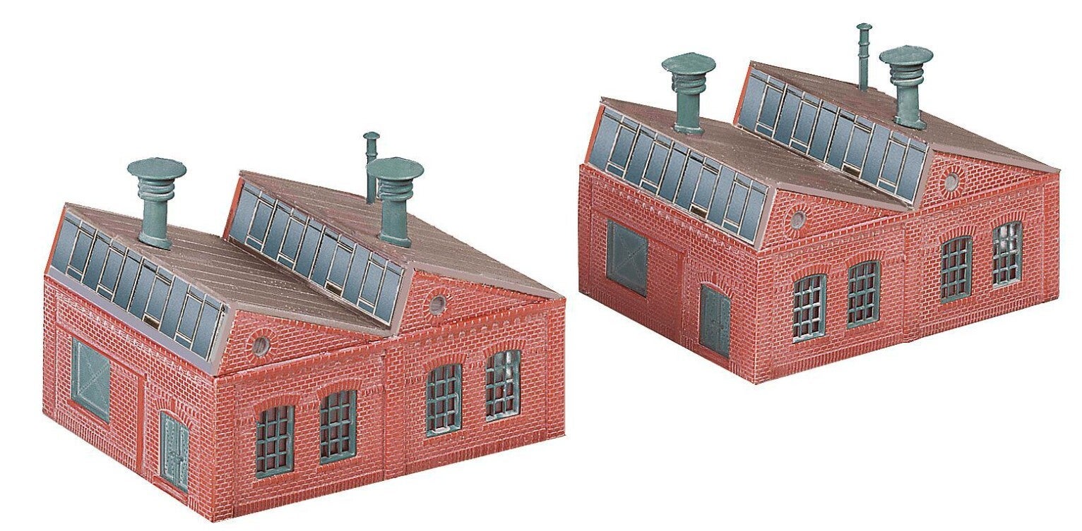Zwei Werkhallen mit Sheddach, passend zum Fabrik-Hauptgebäude (Art. 222201). Mehrfach hinter- und nebeneinander baubar.