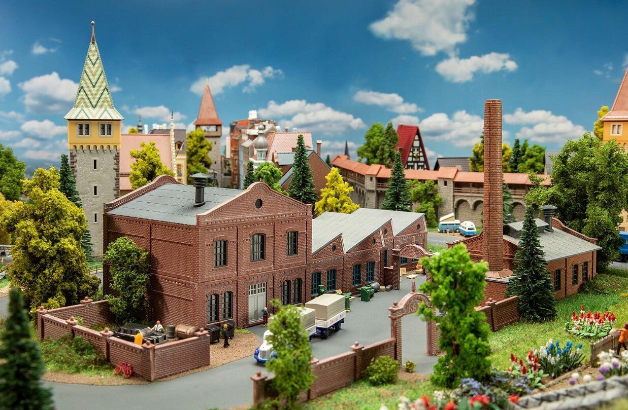 Fabrik aus der Jahrhundertwende mit roten Backsteinwänden und einer großen Halle mit angebauten Kaminhaus und imposantem Schornstein. Ein großzügiges Ensemble aus dem Hauptgebäude sowie zwei kleineren Hallen mit markanten Dachoberlichtern ergänzen die Szenerie. Zudem liegen dem Bausatz zwei repräsentative Backsteinmauerumzäunungen mit Toren bei.