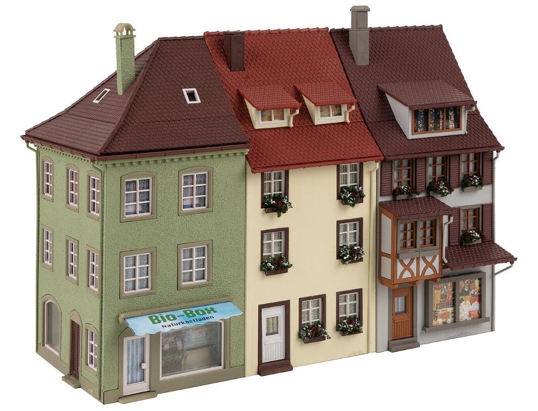 Für Ihre Kleinstadthäuserzeile! Dreiteiliges Gebäude-Set bestehend aus zwei Traufhäusern und einem Reihenendhaus in unterschiedlicher Farbgebung. Die dreigeschossigen Modelle sind mit unterschiedlich gestalteten Fassaden, Ladengeschäften im Erdgeschoss und abgewalmten Dächern mit Dachgauben ausgestattet.
