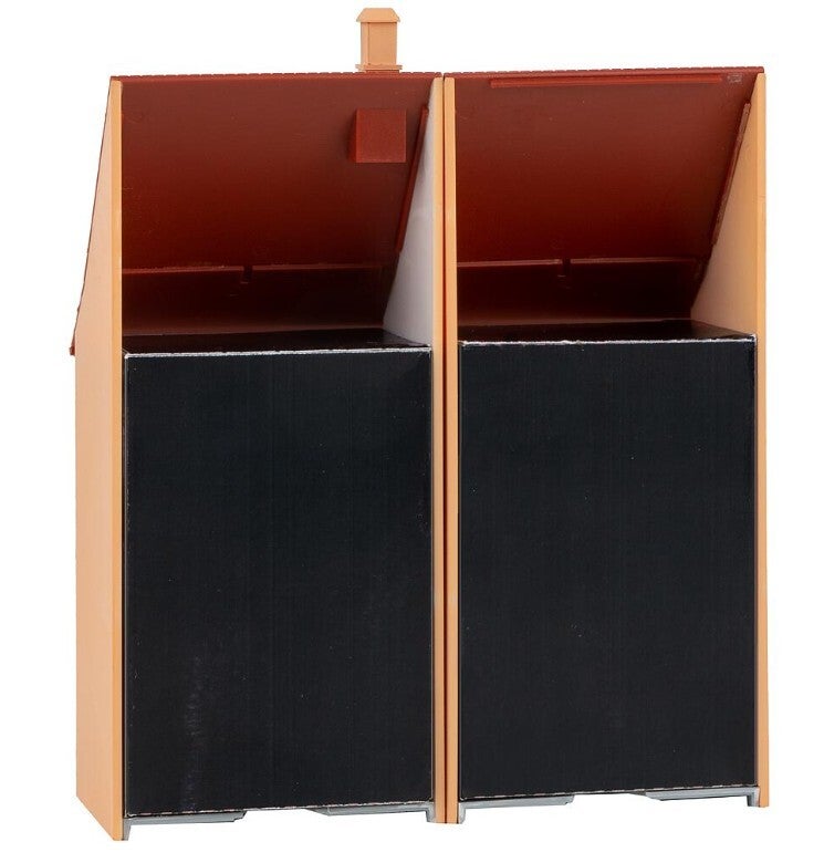 Für Ihre Kleinstadthäuserzeile! Zweiteiliges Reliefgebäude-Set bestehend aus zwei dreigeschossigen, traufständigen Gebäudehälften mit abgewalmten Dach, eine davon mit Ladengeschäft im Erdgeschoss. Die Modelle lassen sich platzsparend an einer Wand oder am Anlagenrand als Hintergrundmodell aufstellen und in Häuserzeilen variabel anordnen.