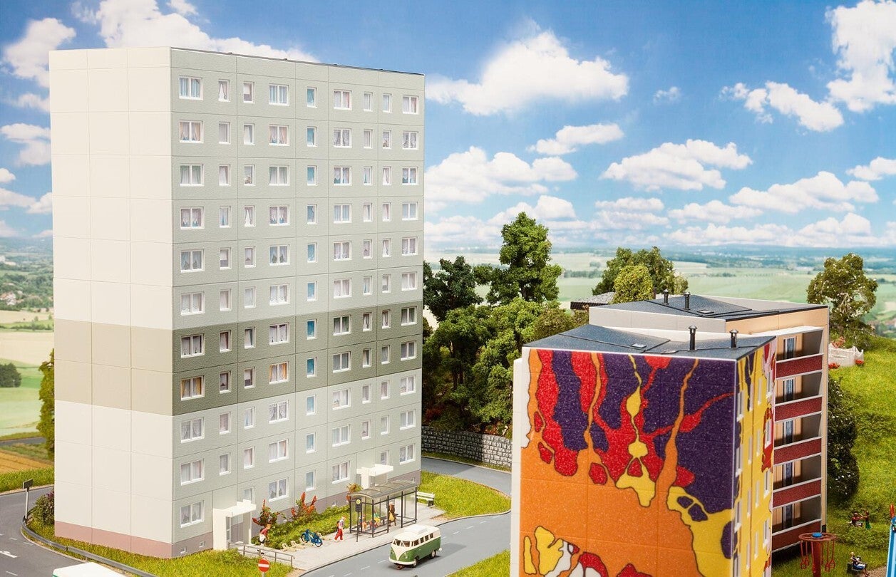 Industrieller Wohnungsbau im Baukastensystem. Set mit zwei ergänzenden Stockwerken (Wandplatten und Balkone, Fenster, Deko-Maske) des Plattenbautypus P2, passend zum Artikel »Plattenbau P2 Basispackung« (Art. 130801). Bitte beachten Sie, dass ein Gebäudesockel und ein Dach nicht zum Bausatzumfang gehören.