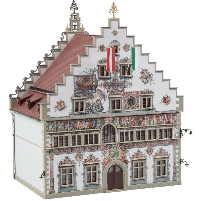 Verbesserte Wiederauflage! Modell des 1436 erbauten »Alten Rathauses« in Lindau mit hochwertigem Digitaldruck der prächtigen Fassadenmalerei zur Lindauer Stadtgeschichte an Nord- und Südfront des historischen Gebäudes mit gedeckter Freitreppe, Verkünder-Erker und Volutengiebeln.