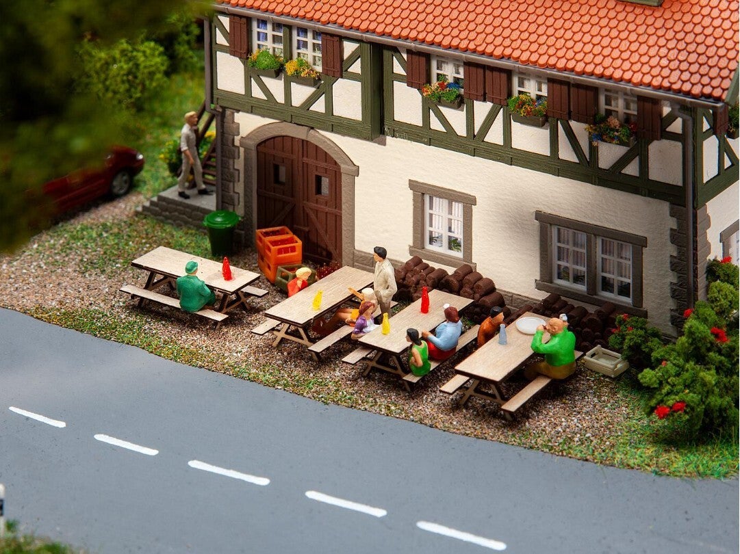 Pausenzeit! Vierer-Set mit im Lasercut-Verfahren hergestellten Picknicktischen mit Bänken.