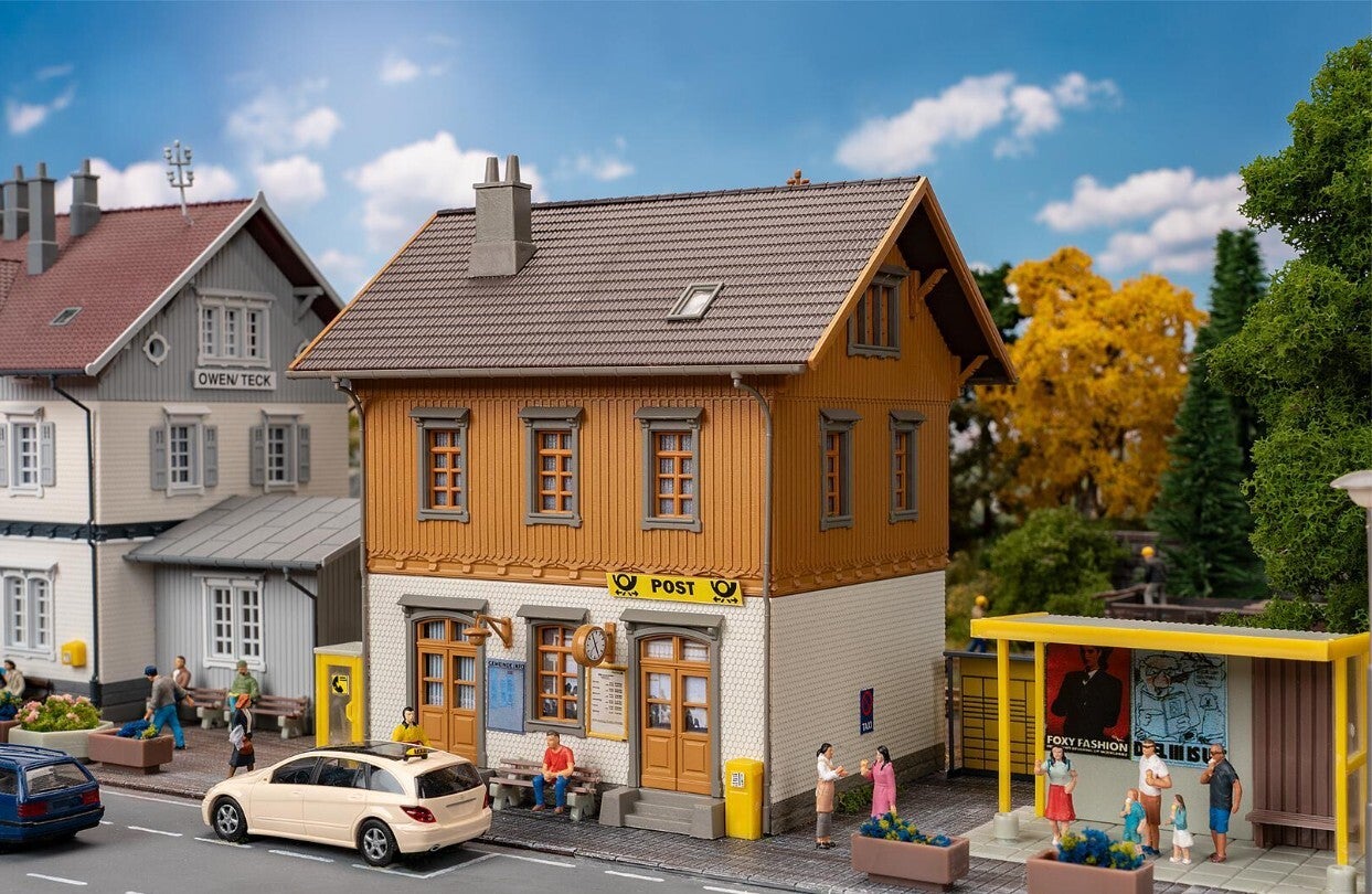 Ländliches Postamt zur Gestaltung einer idyllischen Dorfszene auf der H0-Modelleisenbahnanlage. Das aus der Epoche III stammende Gebäude kommt in einem stilsicher renovierten Erscheinungsbild daher. Passendes Zubehör wie Telefonzellen, Bushaltestellen, Briefkästen, Litfaßsäulen, Parkbänke uvm. liegen dem Bausatz bei.