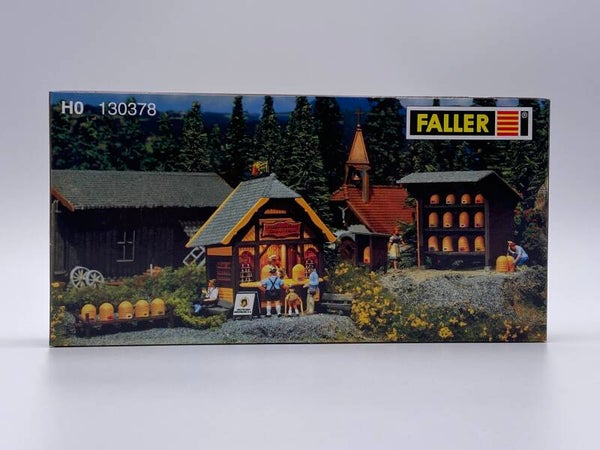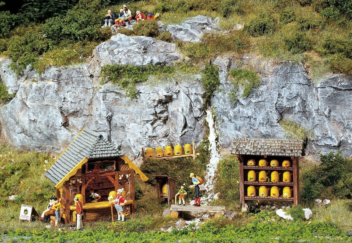 Stand für den Straßenverkauf von Honig und Schnaps. Ein überdachtes Bienenhaus mit strohgeflochtenen Bienenkörben (ohne Bienen) und frei stehende Bienenkörbe sind mit enthalten. Die ideale Ergänzung zu den Schwarzwaldmodellen 130366 und 130367.