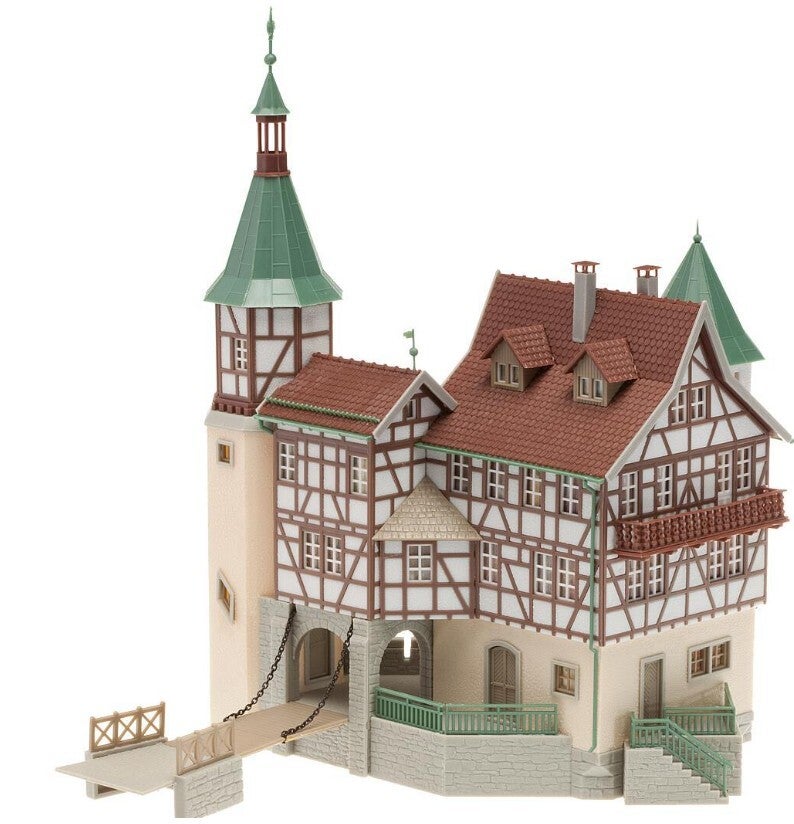 Mit diesem Modell hat der Modellbauer die Möglichkeit, ein Jagdschloss mit Holz-Zugbrücke, umgeben von einem Wasser- oder Schlossgraben, in seine Anlage einzubauen.