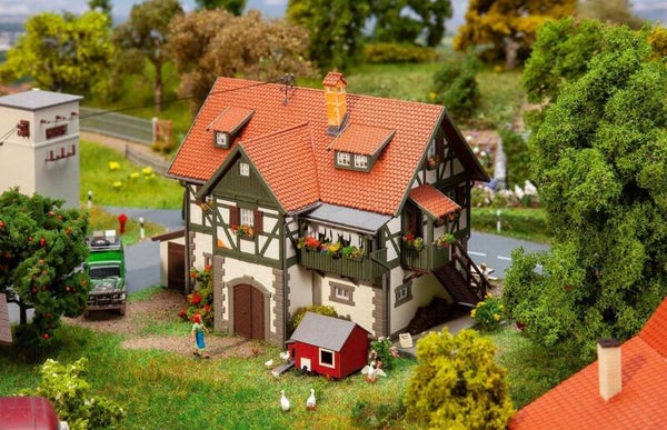 Ländliches, zweigeschossiges Forstamtsgebäude mit Fachwerkobergeschoss, Dachgauben und drittem Giebel. Zur vielseitigen Gestaltung des Modells tragen ein Schuppenanbau, ein Holzbalkon, der überdachte Erker-Eingang, eine Hundehütte und Blumenkästen bei.