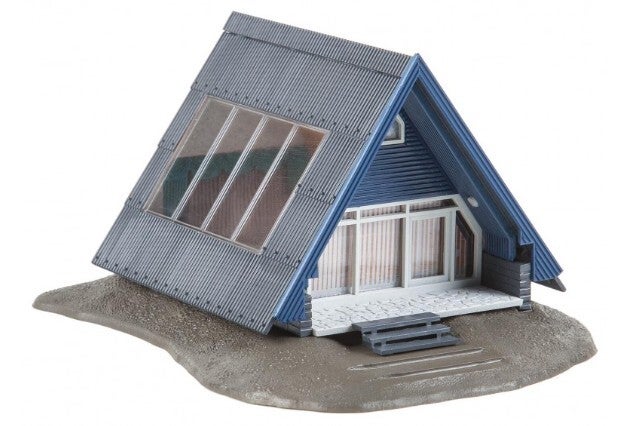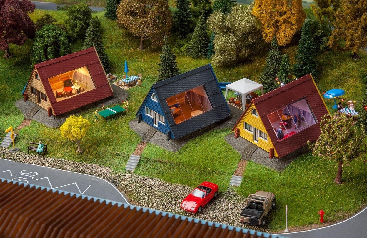 Feriensiedlung bestehend aus drei zeltförmigen Nurdachhäusern unterschiedlicher Farbgebung, jeweils mit großem Dachfenstern und Bodenplatten mit Stufen zu den kleinen Terrassen. Als passende Ergänzung empfohlenes Zubehör: »Gebäude-Inneneinrichtung«, Art. 180545 und »Büroeinrichtung«, Art. 180454.