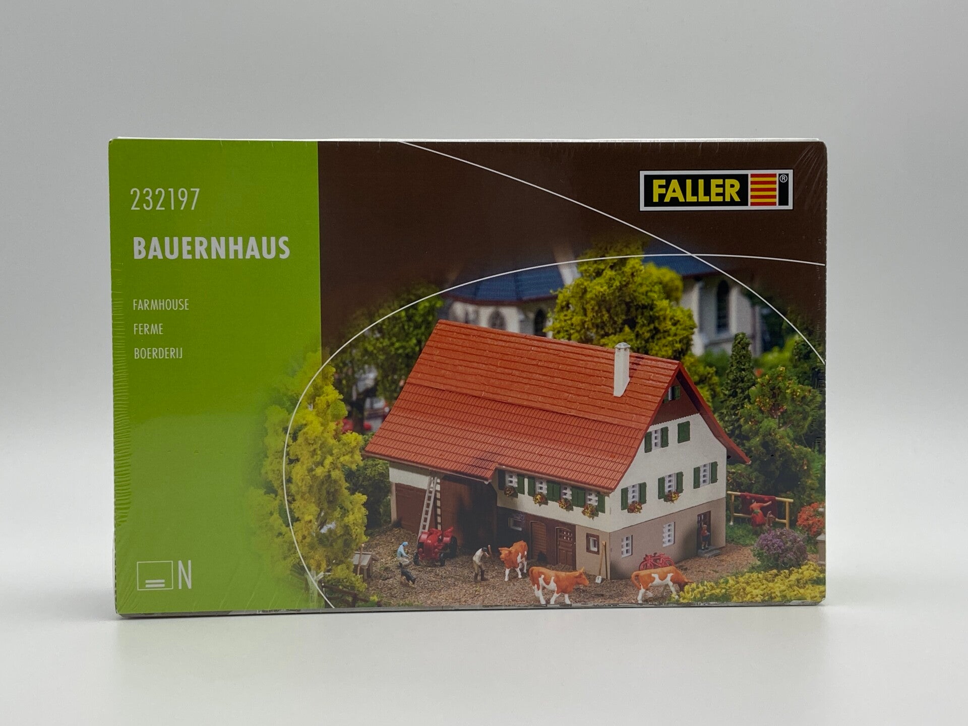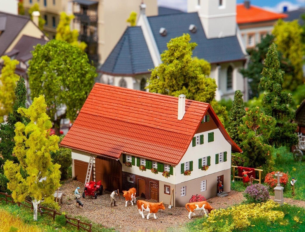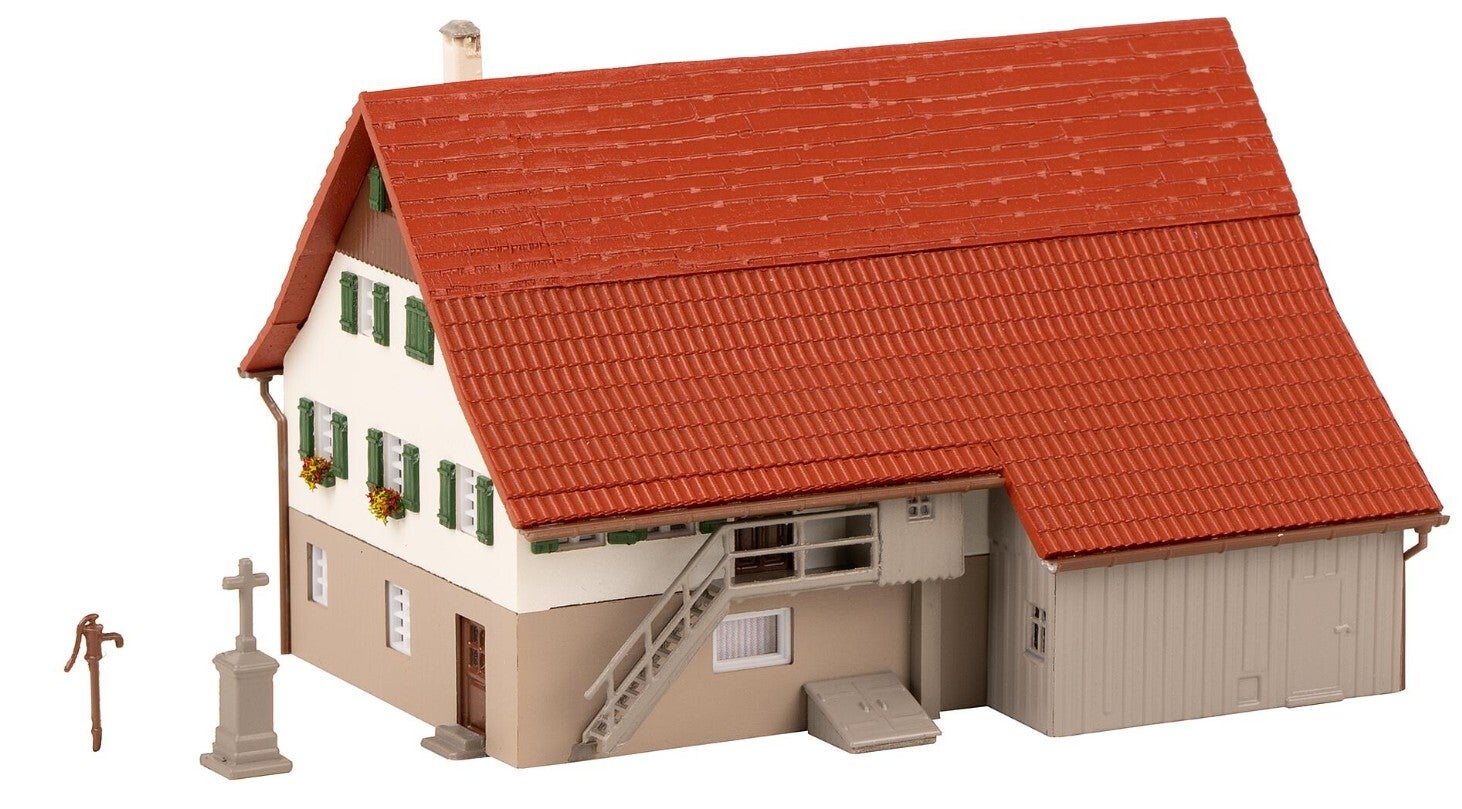 Charakteristisches Einhaus, das Wohn-, Stall- und Scheunenbereich unter einem Dach vereint. Im Erdgeschoss des zweistöckigen Hofes mit unterschiedlichen Dacheindeckungen befinden sich eine große Scheune, ein Schuppen und ein rückwärtiger Bretteranbau. Zur Vielseitigkeit des Modells tragen eine Außentreppe, ein Außenabort, eine Kellerfalle und Eternittafeln an einer Hauswand bei. Als Ausgestaltungselemente liegen ein Wegkreuz und eine Güllepumpe bei.
