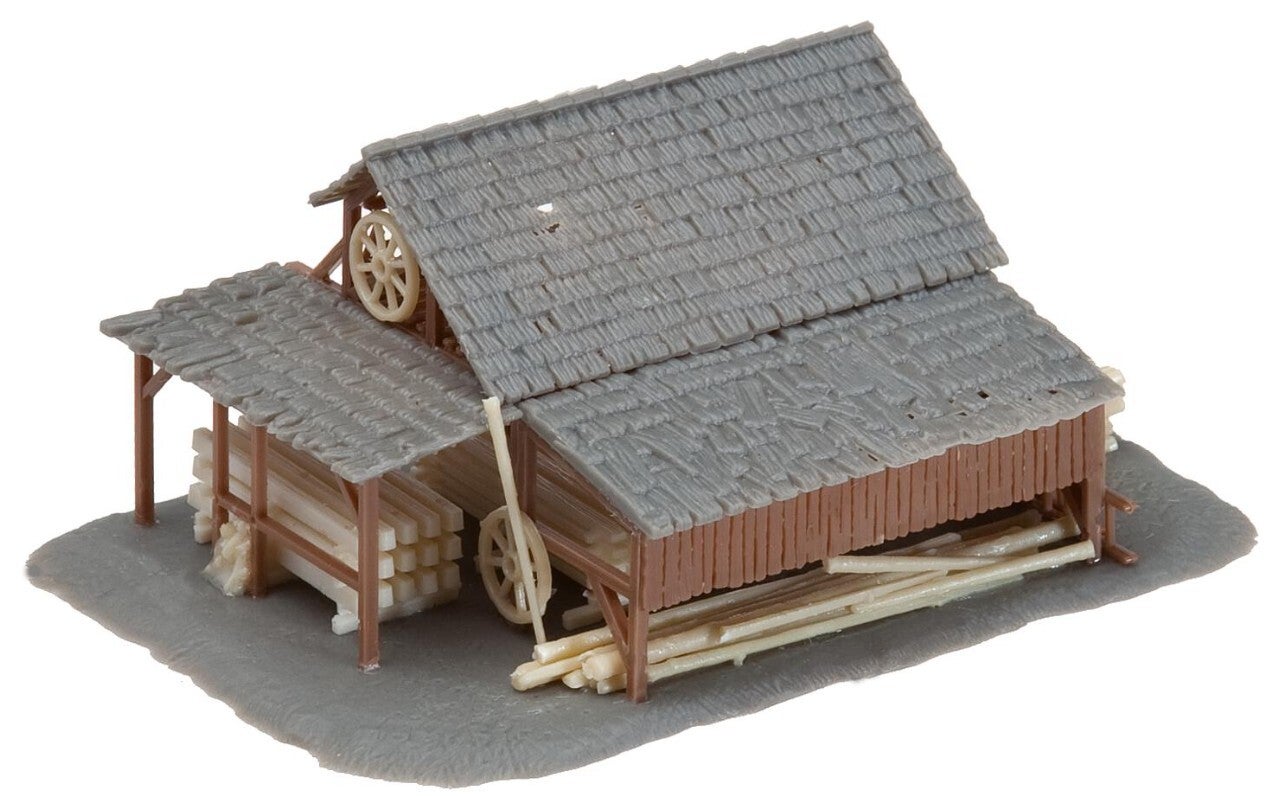 Mit Stämmen, Balken, Brettern und Holzleisten.