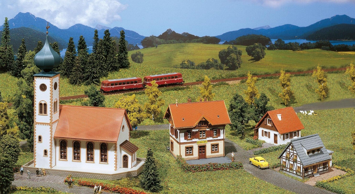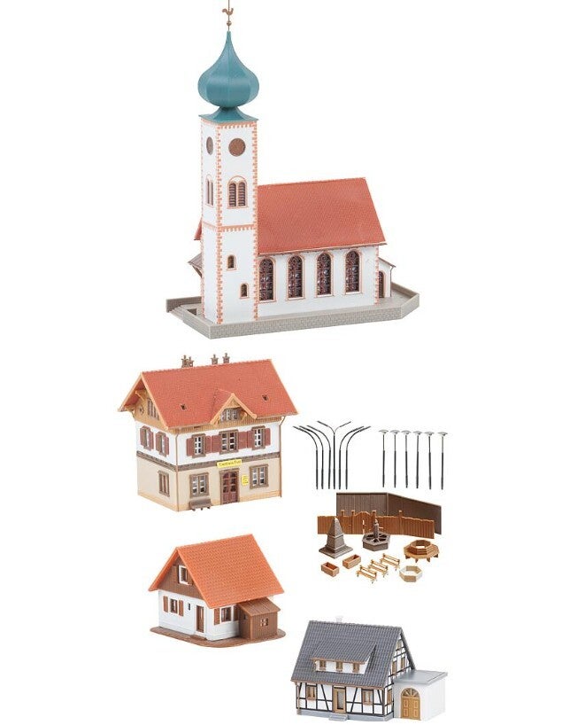 Dorfset bestehend aus den Modellen Dorfkirche, Fachwerkhaus, Einfamilienhaus, Gaststätte und Dorfplatz-Ausschmückungsteilen.