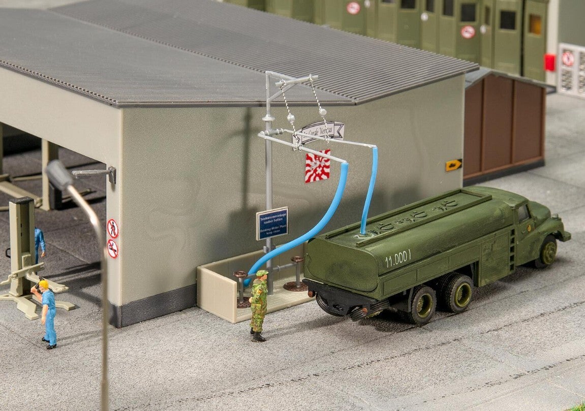 FALLER Military! Ausgabestelle für Trinkwasser mit zwei Abfüllstationen und separat stehendem Pumpenhäuschen.