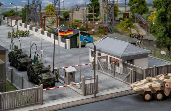 Kasernenzufahrt mit Schiebe- und Eingangstor, Schlagbäumen, Wachgebäude, Wachhäuschen, Umzäunung und Fahnenmasten.