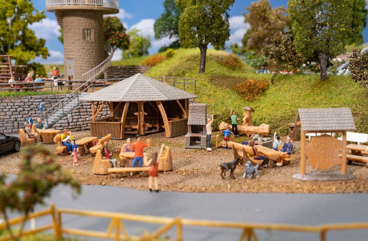Die Luft ist erfüllt von schallendem Kinderlachen, durchdrungen vom verlockenden Duft nach Sommer. Der Grillplatz mit seiner einladenden Hütte, dem plätscherndem Brunnen, den knisternden Grill- und gemütlichen Sitzgelegenheiten und allerlei weiterem Zubehör verspricht ein idyllisches Verweilen. Daneben ragt ein steinerner Aussichtsturm empor, der dazu einlädt, die Umgebung zu erkunden. Doch das ist nicht alles! Klettergerüste und viele abenteuerliche Spielgeräte in Holzoptik setzen der Modellbau-Fantasie keine Grenzen und machen Lust auf einen unbeschwerten Tag im Freien. Hier ist die Bühne für Miniatur-Abenteuer auf dem Spiel- und Grillplatz gesetzt! Inhalt: Grill (2 x), Turm, Hütte, Sitzgelegenheiten, Tische, Gerüste, Sandkasten, Wippen, Holz, Brunnen, Fahnen, Schaukel, Holzstapel, Spiellokomotive mit Anhänger.