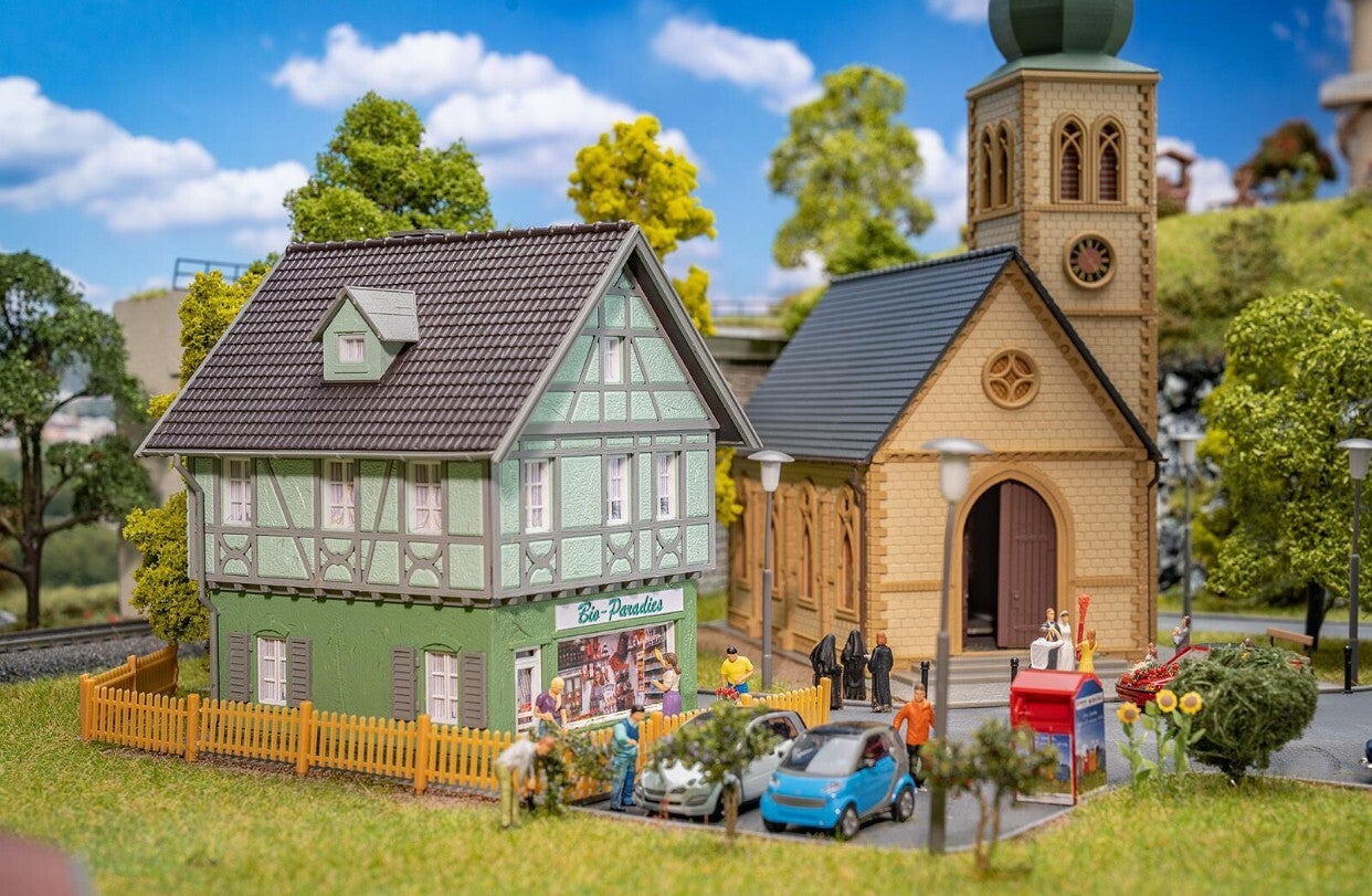 Dieses bezaubernde Set entführt in eine idyllische Modellwelt voll malerischem Charme. Es beinhaltet eine typisch ländliche Kirche mit kunstvollen Buntglasfenstern und einer verspielten Turmspitze (zwei enthalten, austauschbar) sowie zwei farbenfrohe Fachwerk-Geschäfte: Einen Bio-Laden in sanften Mint-Tönen und ein lebhaft gelbes Spielwarengeschäft. Tauche ein in die ruhige und einladende Atmosphäre des Landlebens und genieße die zauberhaften Szenen dieses Miniatur-Dorfes! Inhalt: Kirche mit austauschbarer Spitze, zwei Turmspitzen, Spielwarengeschäft, Bio-Laden.
