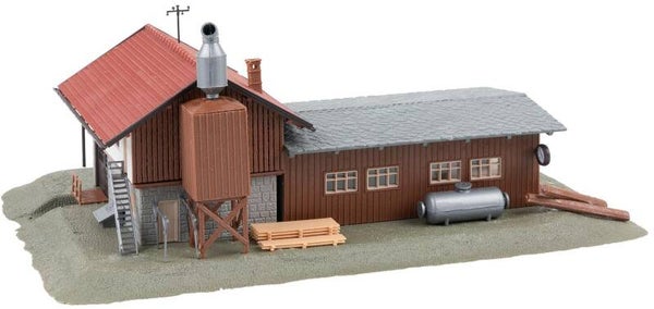 Kleine Sägemühle mit Laderampe, Wohnteil und abwechslungsreicher Putz-, Holz-und Steinfassade. Für die Ausstattung des Modells liegen ein Mühlrad, ein Spänebunker, ein Silo, Holzstämme und Bretterstapel bei. Bodenplatte inklusive.