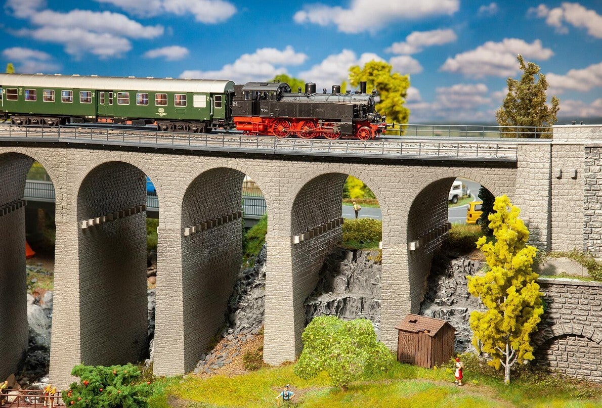 Set bestehend aus einer geraden Viaduktbrücke mit Gleisbett und hohen Pfeilern. Im Bausatzumfang sind eine Brückenkopfgarnitur und ein zusätzlicher Pfeiler zur Verlängerung der Brücke enthalten. Geeignet für Märklin C-Gleis und alle anderen Gleise.