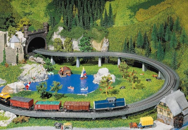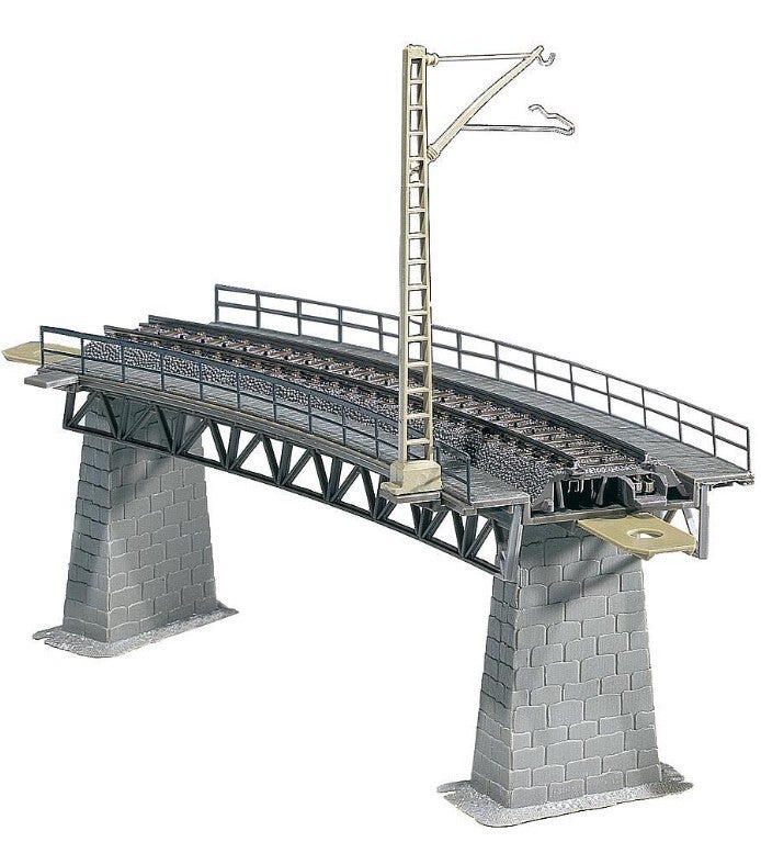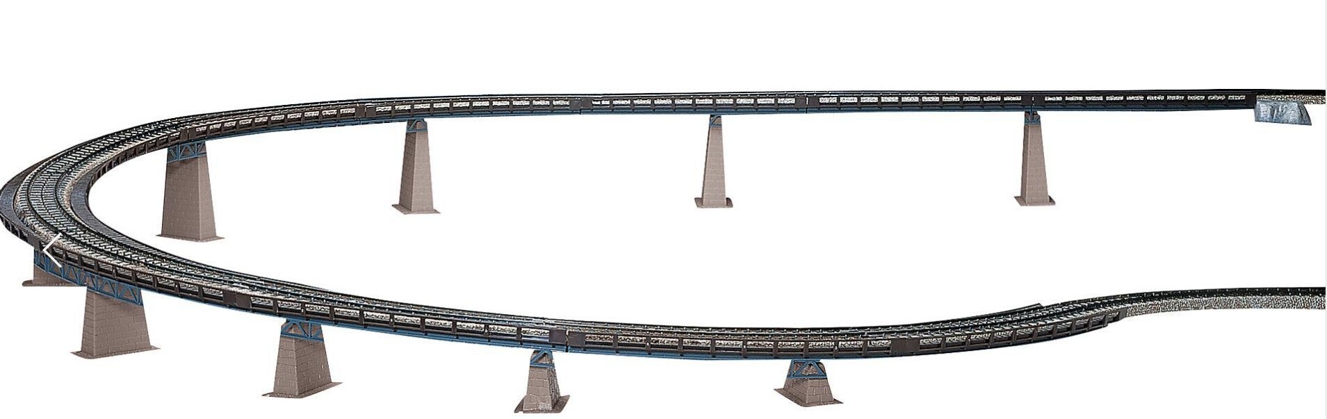 Dieser Bausatz enthält: 4 gerade und 8 gebogene Gleisbetten, je 2 Pfeiler 15, 25, 35, 45, 55 und 65 mm, 4 Pfeiler 75 mm, 6 Pfeilerkopfstücke 8 mm zur Verlängerung auf das Höhenmaß der FALLER-Brücken und Verbindungslaschen für die Gleisbetten. Die Gleisbetten sind für die Aufnahme von Modell- und C-Gleisen geeignet. Zur Verlängerung einer Auf- bzw. Abfahrt sind weitere Pfeiler (Art. 120473), gerade Gleisbetten (Art. 120474) und gebogene Gleisbetten (Art. 120475) erhältlich. Durchfahrtshöhe: 66 mm bzw. 81 mm mit Verlängerungsteilen. R=360 mm