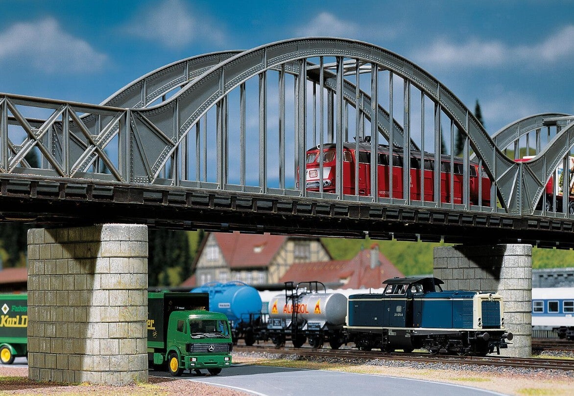 360 mm lang, kpl. mit 2 geraden Gleisbetten und 6 Betonpfeilern à 7 mm. Zu dieser Brücke passt die Brücke (Art. 120534) als Vorflutbrücke. Für alle Modellgleise verwendbar, außer Märklin C-Gleis.
