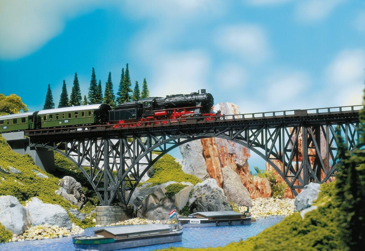 355 mm lang, kpl. mit 2 geraden Gleisbetten. Die Trägerkonstruktion kann in zwei Varianten zusammengesetzt werden. Für alle Modellgleise verwendbar, außer Märklin C-Gleis. Gleisbetthöhe: 117 mm, abnehmbar auf 91 mm.