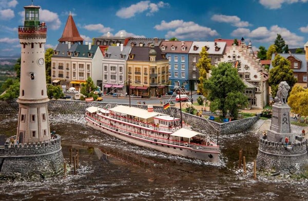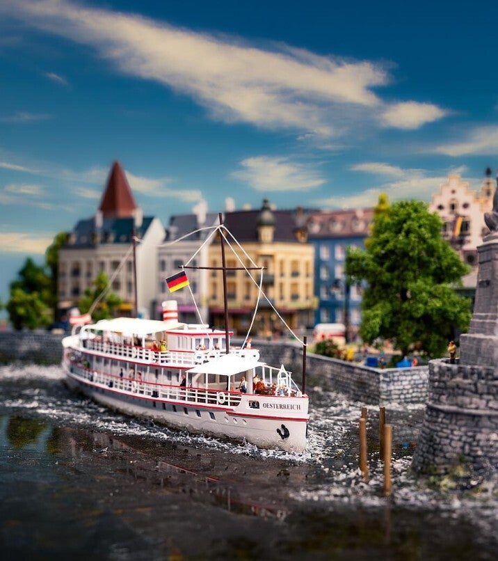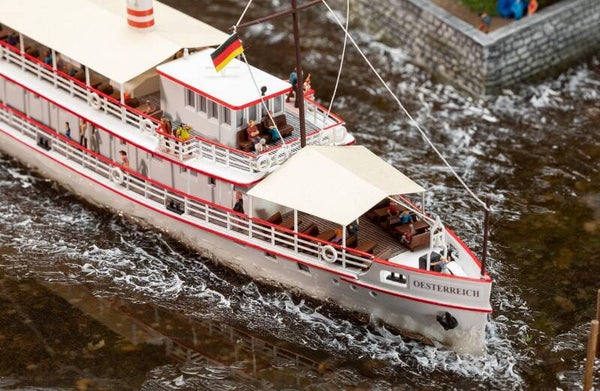 Maßstäbliches Modell des Art déco Bodensee-Fahrgastschiffes, das seit 1928 bis heute auf dem Bodensee verkehrt. Das Modell zeigt die heutige Bauform nach der Restaurierung 2019. Die historische Schifffahrt Bodensee GmbH wirbt auf Ihrer Seite: »Bezaubernd anmutig ist nicht nur das Äußere der Oesterreich. Wer die Gangway betritt, ihr langsam näherkommt, der spürt sofort die unglaubliche Leichtigkeit, die diesem Schiff innewohnt. Die Atmosphäre an Bord – prickelnd, anregend wie ein Glas Champagner. Spätestens nach dem ersten Rundgang, wenn man mit einem köstlichen Aperitif in der Hand an Deck der Oesterreich auf den See hinausgeleitet, ist jeder Gedanke an den Alltag verflogen. Nach der umfassenden Renovierung strahlt jedes Detail.« Wir sagen, genauso ist es. Ein wunderbarer Hingucker auf einer Modellanlage oder auch als Standmodell in der Vitrine.