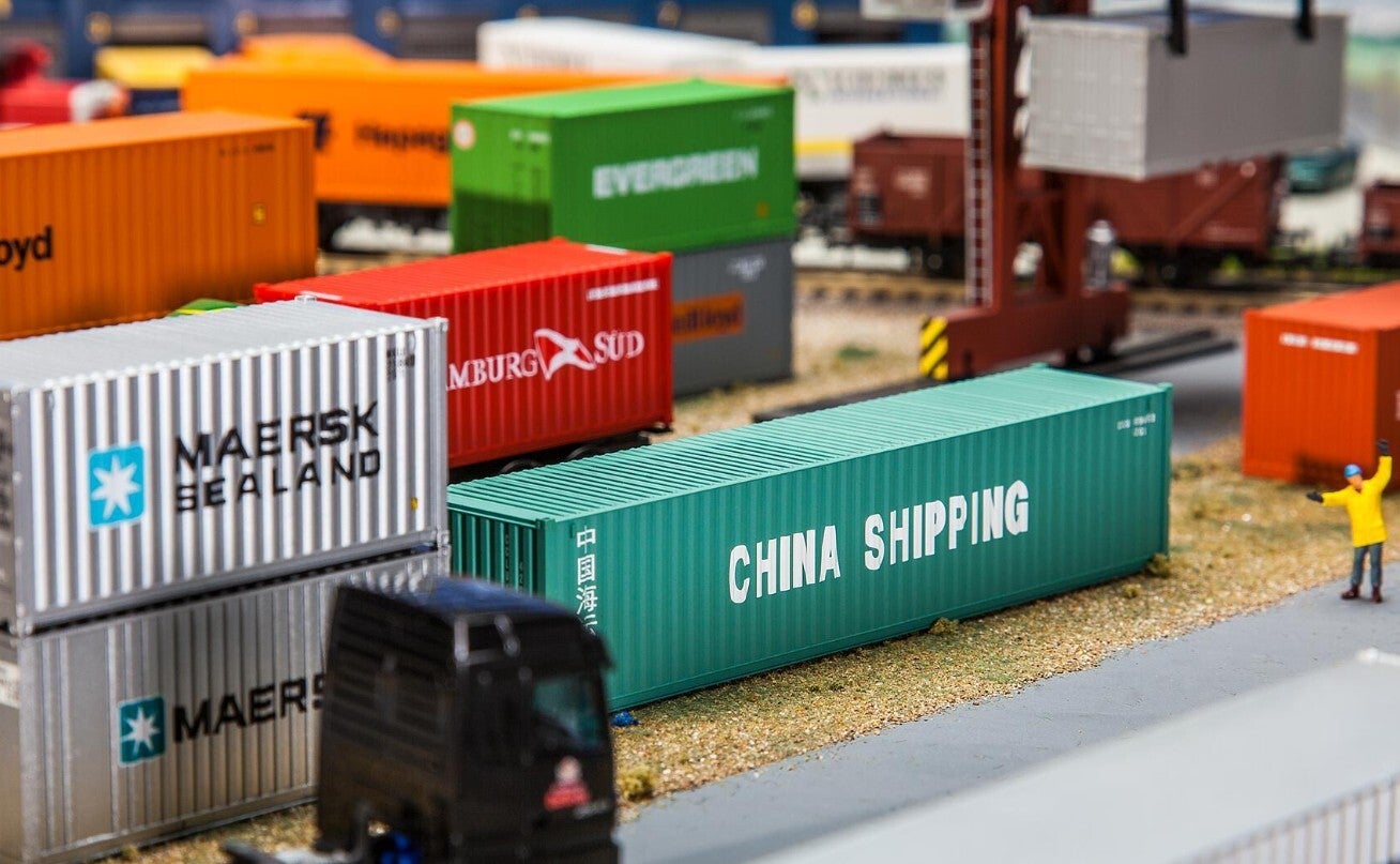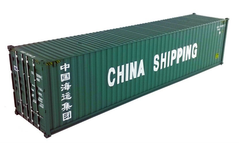 40' Container mit dem Labeling des Unternehmens »CHINA SHIPPING«. Einzeln erhältliche, genormte Stahlcontainer mit unterschiedlichen Ladevolumen, Lackierungen und Beschriftungen, die in der Transportkette das schnelle und einfache Verladen und Befördern von Gütern mit der Bahn, auf Lkw oder Schiffen ermöglichen. Lagernd gestapelt setzen die stabilen Großbehälter eindrucksvoll Bahnhöfe oder Containerterminals als Knotenpunkte des internationalen Warenverkehrs in Szene.