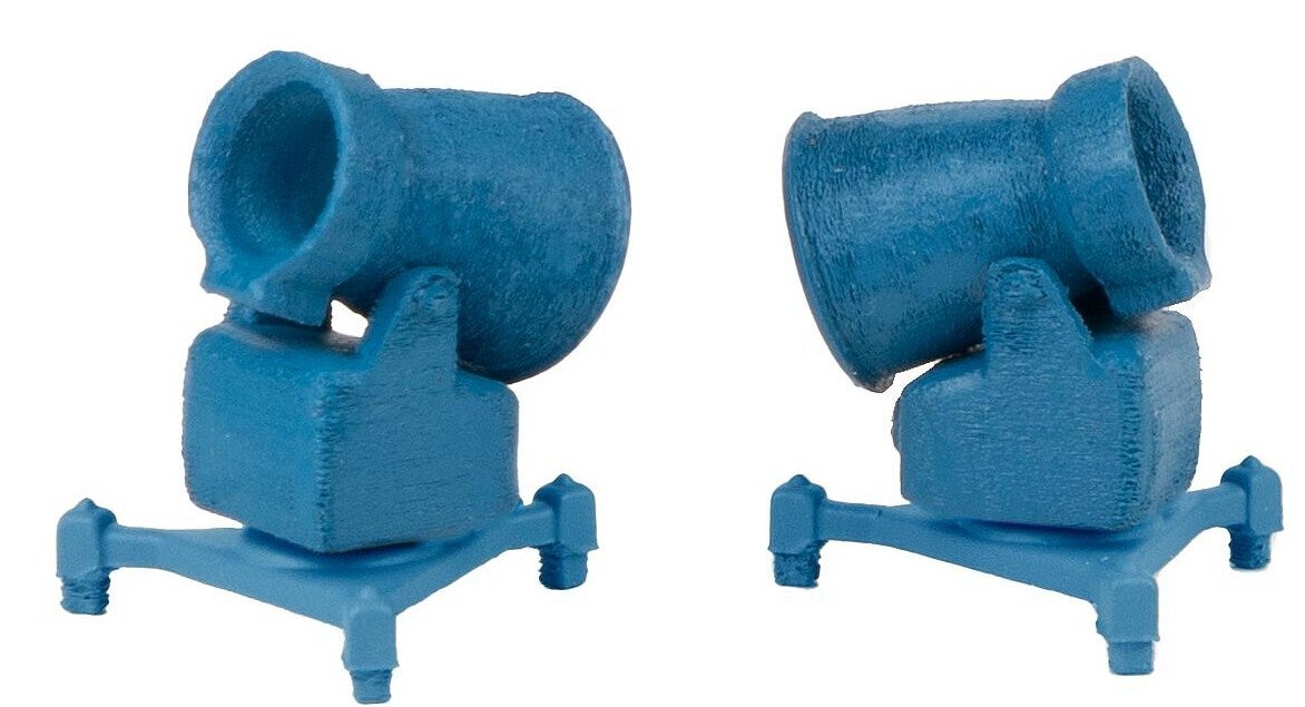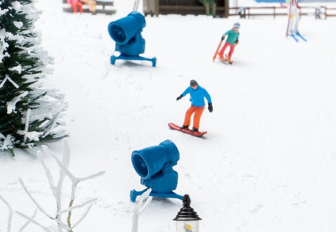Entsprechend der Realität. Wintersportorte ohne Schneekanonen sind die Ausnahme. Daher auch für die Modellwelten zwei Schneekanonen in Anlehnung an ein Original der Fa. DEMACLENKO.