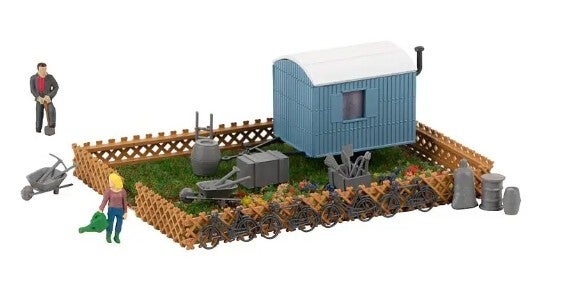 Eine kleine Gartenoase auf der Modellanlage. Ausgestaltungs-Set für eine Schrebergartenszene bestehend aus einem Landschafts-Segment mit blühenden Blumen, einem Bauwagen, einer Umzäunung, gartentypischen Arbeitsgeräten und zwei Miniaturfiguren bei der Gartenarbeit.