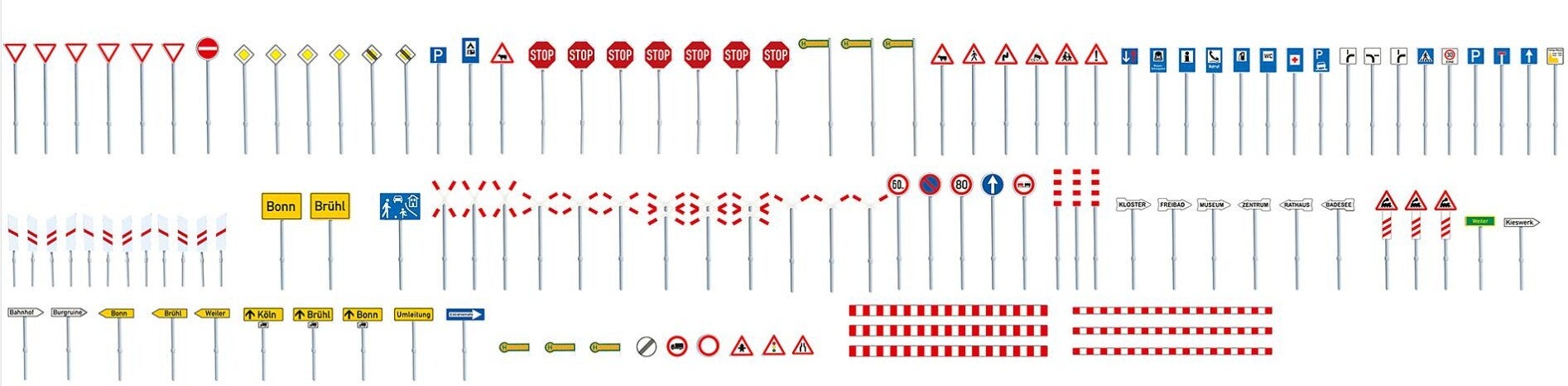 Set mit 120 digital bedruckten Ortsschildern und Verkehrszeichen mit Pfosten sowie Andreaskreuzen.
