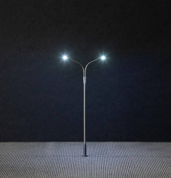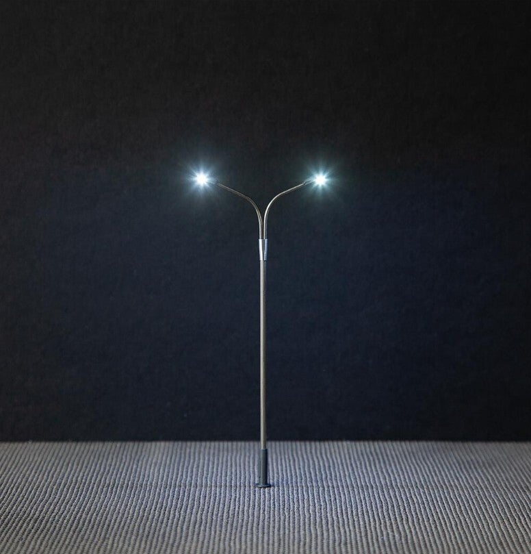 Moderne Peitschenleuchte mit zwei Auslegern. Besonders geeignet zur Ausgestaltung von Stadt-, Straßen- und Industrieszenerien. Der Mast ist aus Metall gefertigt und die Leuchtenhöhe variabel einstellbar. Die filigrane zweiflammige Leuchte ist mit langlebiger LED-Technik ausgestattet. Höhe: 100 mm. Lichtfarbe: kaltweiß. Das Produkt ist anschlussfertig für 12 V Gleichspannung (DC). Nutzen Sie für den Betrieb der Leuchte den Transformator, Art. 180641.