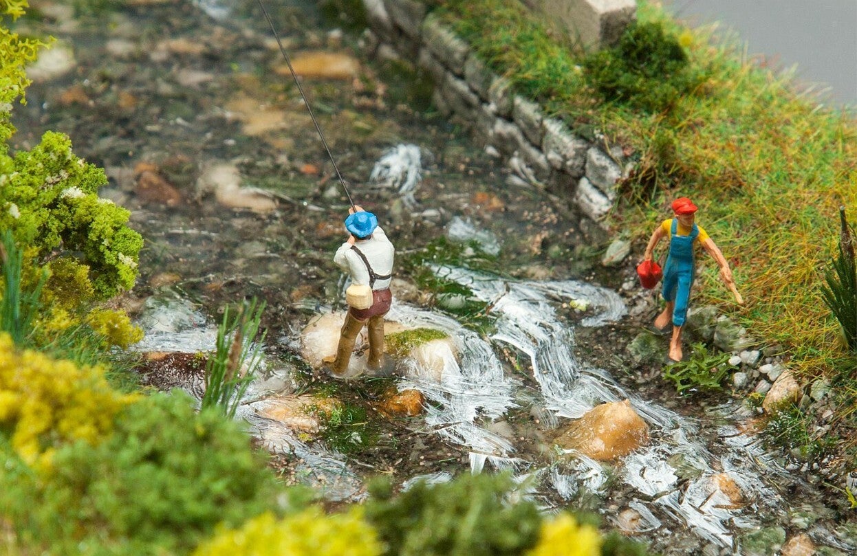 Ein neu gestalteter Bach plätschert über die Modelleisenbahnanlage und sorgt für eine äußerst entspannte Atmosphäre. Der Klang erklingt als ununterbrochene Schleife, solange die Stromversorgung gewährleistet ist. Anschluss: 12 V, Gleichspannung.