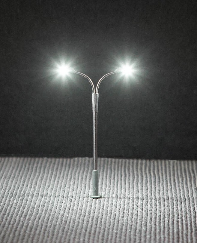 Moderne Peitschenleuchte mit zwei Auslegern. Besonders geeignet zur Ausgestaltung von Stadt-, Straßen- und Industrieszenerien. Der Mast ist aus Metall gefertigt und die Leuchtenhöhe variabel einstellbar. Die filigrane zweiflammige Leuchte ist mit langlebiger LED-Technik ausgestattet. Höhe: 65 mm. Lichtfarbe: kaltweiß Das Produkt ist anschlussfertig für 12 V Gleichspannung (DC). Nutzen Sie für den Betrieb der Leuchte den Transformator, Art. 180641.